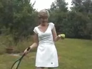 在面具和连裤袜泵的金发女郎吸她的丈夫